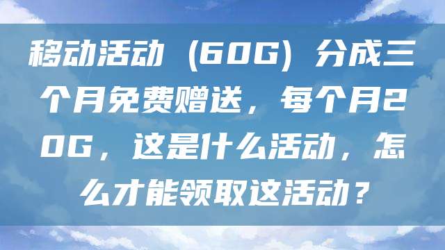 正文 移动活动 (60G) 分成三个月免费赠送,每个月20G,这是什么活动,怎么才能领取这活动? admin V管理员 /05-21/395阅读 0521 广电-飞卿卡29元/月【192G流量】 192G高速流量+本地号码+可选号 免费办理 电信-飞临卡29元/月【160G流量】 160G流量+100分钟 免费办理 1应该是南京高校送60G流量的活动吧,像我在南京,关注“南京移动校园生活”微信公众号,如果符合条件就可以办理了。