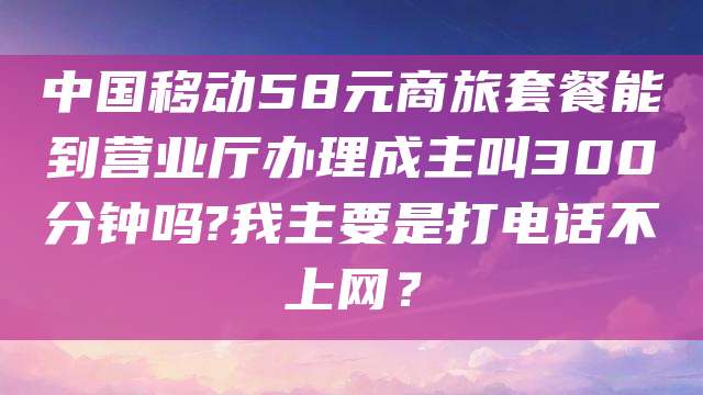 正文 中国移动58元商旅套餐能到营业厅办理成主叫300分钟吗?我主要是打电话不上网? admin V管理员 /05-22/348阅读 0522 广电-飞卿卡29元/月【192G流量】 192G高速流量+本地号码+可选号 免费办理 电信-飞临卡29元/月【160G流量】 160G流量+100分钟 免费办理 我才升级58元套餐,流量12G,电话200分钟,寬帶100M。另外机顶盒10元。等于每月68元。不知和算吗?西安市用户。可以的。您这个套餐是商旅套餐现在可以改成飞享套餐,58套餐里面就带有300分钟免费通话。没有流量。这个你可以拨打10086人工服务,或者携带本人身份证到附近的移动营业厅,详细咨询后,再进行更改。