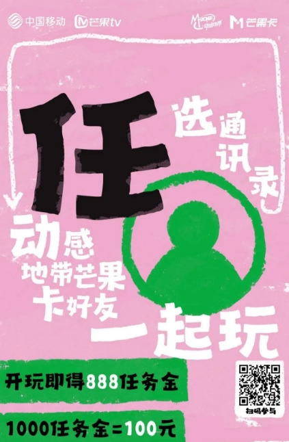 ❶报名得任务金:进入【芒果TV App】搜索“芒果卡俱乐部”扫码“任务金海报”参与活动,即可立即获得888任务金。