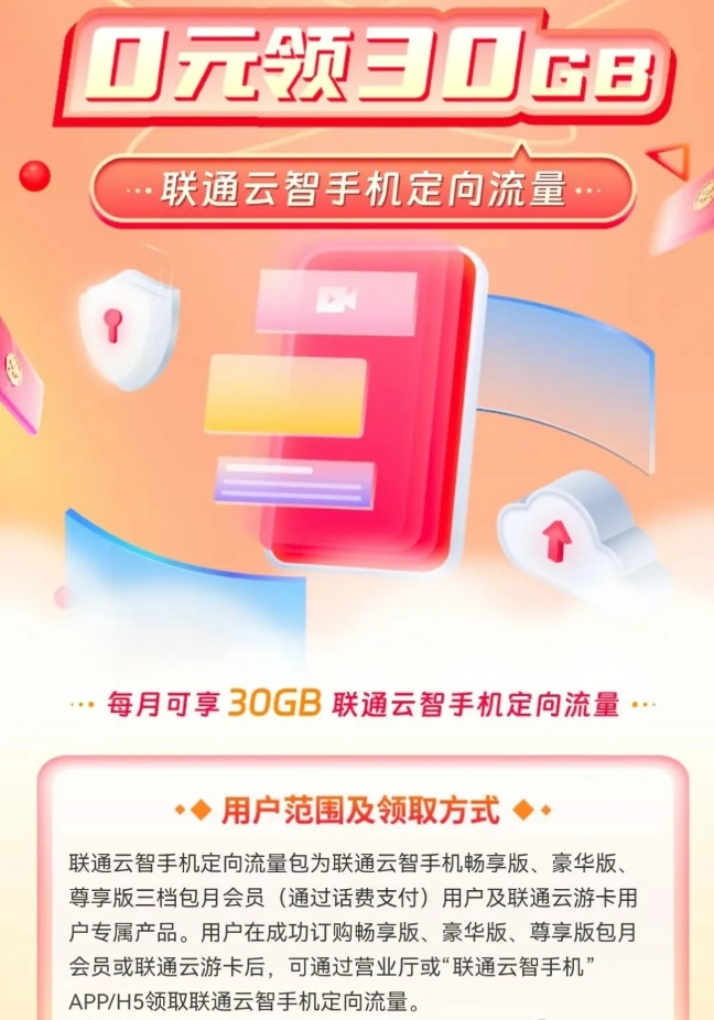活动对象:仅限通过话费支付订购联通云智手机畅享版、豪华版、尊享版三档会员月包和联通云游卡的中国联通用户(物联网卡用户不可领用)