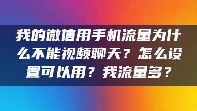 正文 我的微信用手机流量为什么不能视频聊天?怎么设置可以用?我流量多? admin V管理员 /前天/14阅读 1001 广电-飞卿卡29元/月【192G流量】 192G高速流量+本地号码+可选号 免费办理 电信-飞临卡29元/月【160G流量】 160G流量+100分钟 免费办理 1因为手机网络助手禁止了微信的数据网络功能,无线网可以使用。或者手机设置了流量限额,达到上限就不能使用数据网络。进入个人界面,点击“设置”。选择“通用”。在弹出的小框框中选择“3g和4g和WI-FI”。设置完成后,非wifi环境下,就可以视频聊天了。