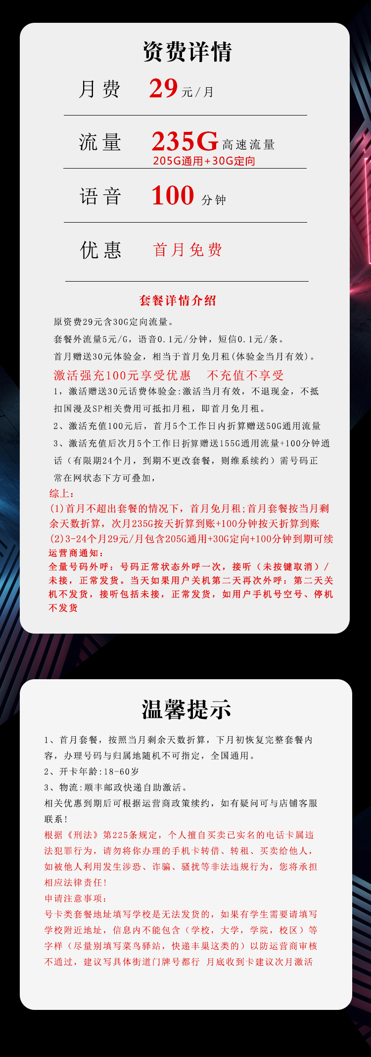 ⑤激活方式:可自助激活或配合快递小哥上门面对面协助激活,激活后需在专属渠道充值100元,才能享受资费政策,收到卡7天内激活,逾期作废;