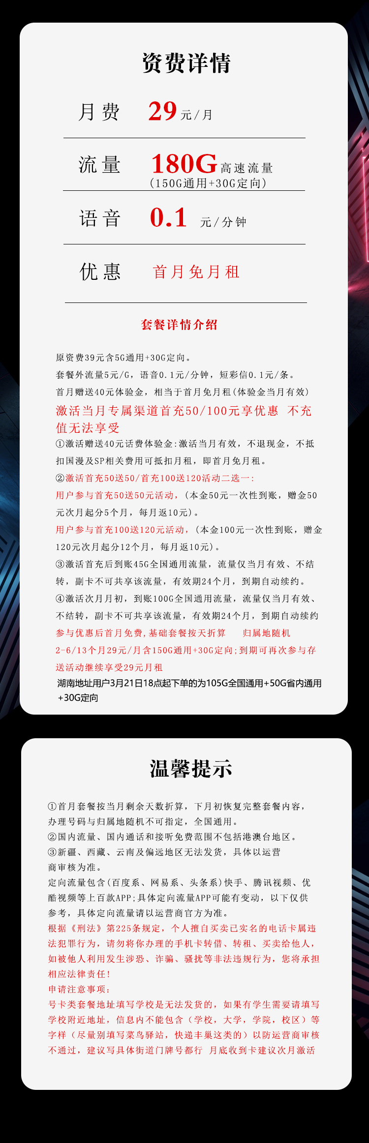 2-6/13个月29元/月含150G通用+30G定向;到期可再次参与存送活动继续享受29元月租