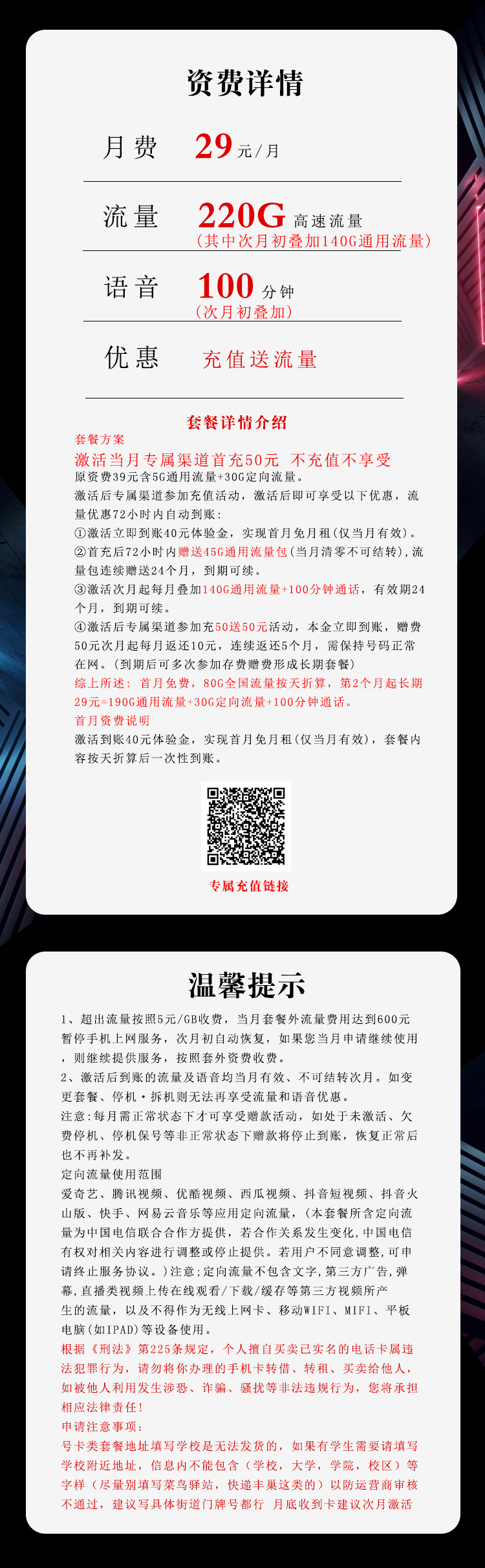 综上所述: 首月免费,80G全国流量按天折算,第2个月起长期29元=190G通用流量+30G定向流量+100分钟通话。
