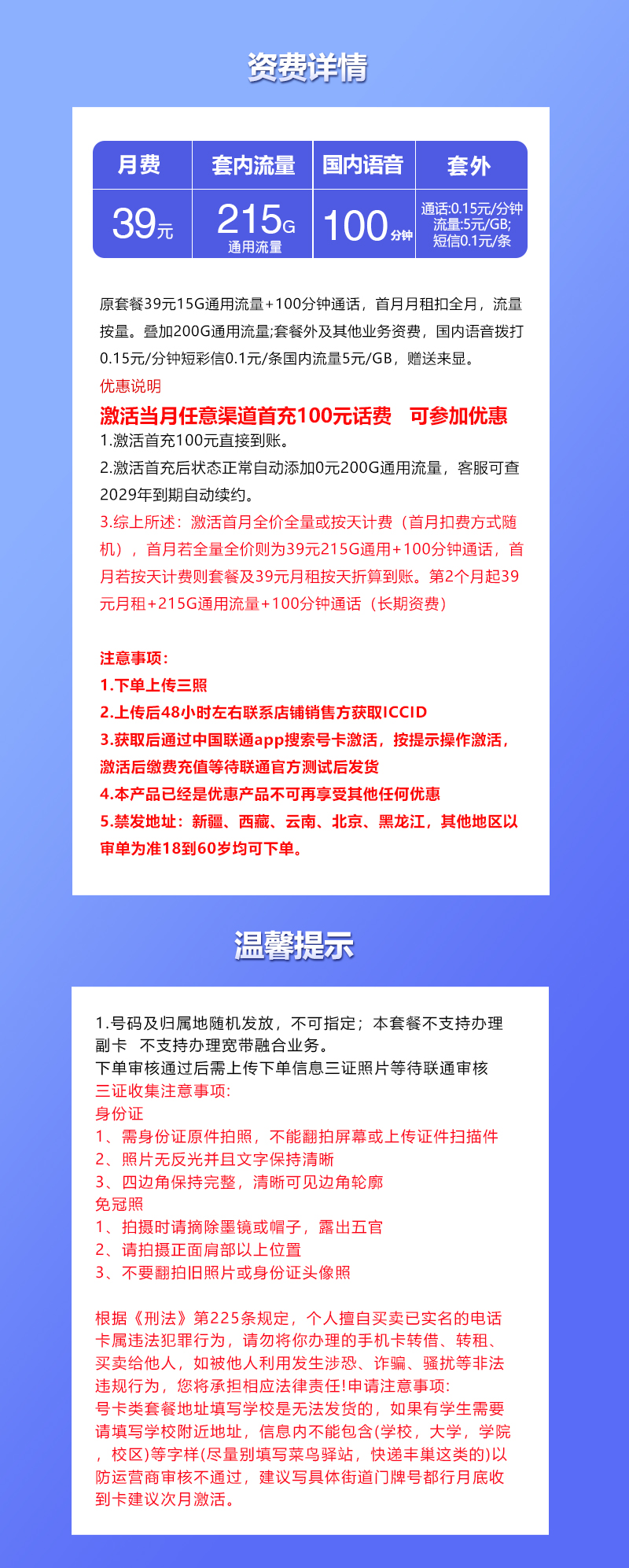3.综上所述:激活首月全价全量或按天计费(首月扣费方式随机),首月若全量全价则为39元215G通用+100分钟通话,首月若按天计费则套餐及39元月租按天折算到账。第2个月起39元月租+215G通用流量+100分钟通话(长期资费)