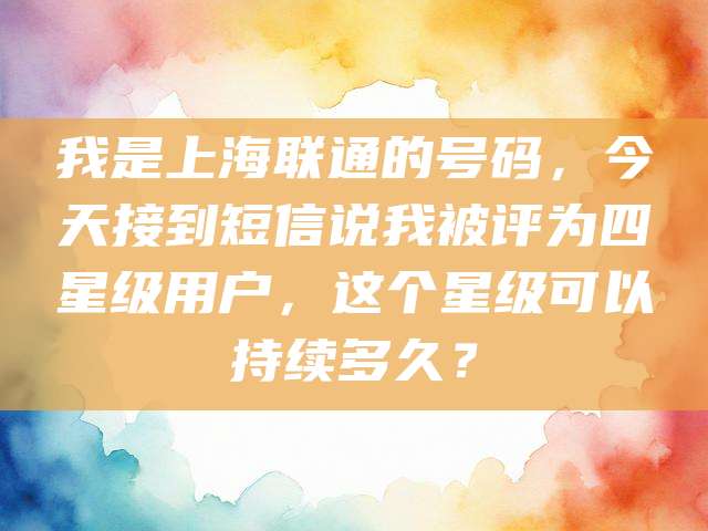 正文 我是上海联通的号码,今天接到短信说我被评为四星级用户,这个星级可以持续多久? admin V管理员 /04-24/443阅读 0424 广电-飞卿卡29元/月【192G流量】 192G高速流量+本地号码+可选号 免费办理 电信-飞临卡29元/月【160G流量】 160G流量+100分钟 免费办理 “星级客户”、“贵宾客户”、“忠诚客户”的评级均为次月生效,有效期为一年,在有效期截止前一个月,重新对客户级别进行评定。